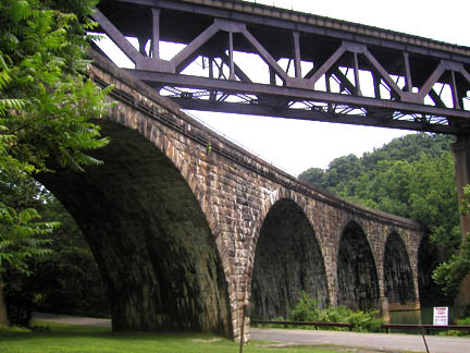 Stone Arches over Conemaugh RiverBelow the flood control dam, the original arch bridges emerge from a tunnel that is now closed; bicyclists must go over the ridge that the tunnel goes through. The relocated railroad crosses over the original stone bridge, which carries the trail over the river here |