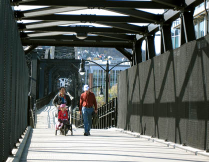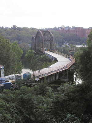 Riverton BridgeThe challenge of a safe trail crossing of the Monongahela River near McKeesport was resolved by rerouting the little remaining traffic that used the Riverton Bridge, abandoning the bridge for railroad use, and converting the bridge for trail use. Photo by Roy Weil |