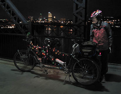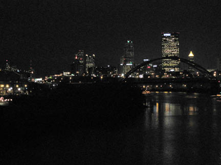 Pittsburgh at Night from Hot Metal BridgeThe Hot Metal bike/ped bridge offers one of the greatest views of Pittsburgh to be had anywhere in the city. Each year the city celebrates the start of the holiday season with “Light Up Night”, and most office buildings keep their lights on to brighten the festivities. Bicyclists join the celebration with rides around the city. These two views from the Hot Metal Bike/Ped Bridge were taken on Light Up Night 2009.