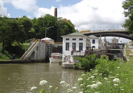 Old and New at LockportThe original canal had two flights of five locks, one for passage in each direction. One of these remains; the other has been replaced by a single modern deep lock |