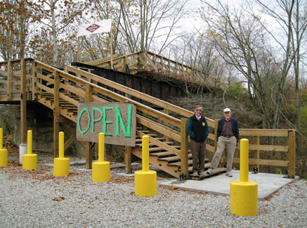 Safety Improvement at Venice CrossingThe Montour Trail, otherwise continuous for many miles in both directions, is interrupted at this intersection by a missing bridge. The trail continues to both ends of the demolished bridge, but the bridge is 15 feet above the road. Trail travelers have been forced to detour for a half mile along busy PA50. An all-volunteer project of the trail group reduced the hazards for trail users by installing a stairway from the old bridge down to the side of the road. The slope of the stairs and a wheel trough provide easy passage for bicyclists |