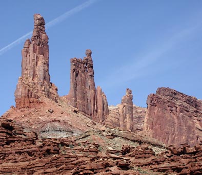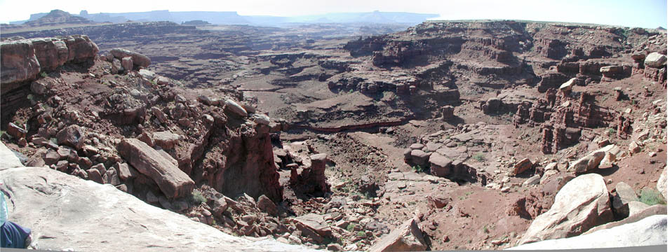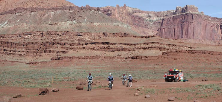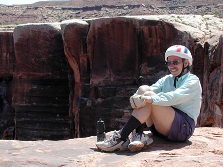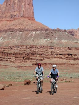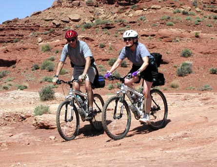 Someone asked us "is it like the Grand Canyon?", and we replied that it's a bit like being on the top of the Grand Canyon as you look to the left and the bottom of the Grand Canyon as you look to the right, though it's at a more human scale. The top at Island in the Sky is at about 6000', and the bottom of the Shafer switchbacks is about 47-4800'. From there we worked our way down to about 4000' at Mineral Bottom (then climbed 1000' to the top of the Mineral Bottom switchbacks). In between there were two big 500' climbs and descents, and the rest was rolling with occasional short steep hills. Absolutely fantastic!