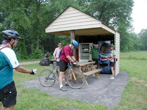 Larry, Roy, Steve, Tom, and Martha take advantage of a railside vending kiosk |